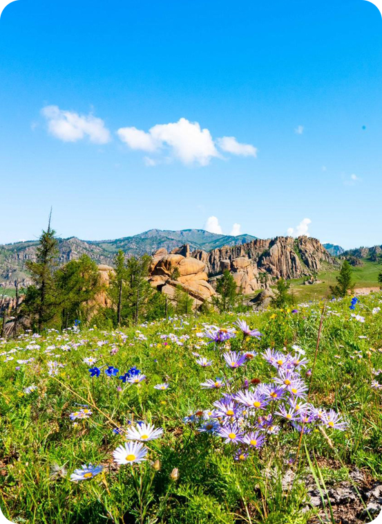 Part of the Khan Khentii Protected Area, Gorkhi–Terelj National Park combines dramatic mountain scenery, crystal-clear rivers, and peaceful valleys. The name “Terelj” comes from a wild rhododendron-like plant (Ledum) that blooms in late spring, painting the valleys with purple hues. Established as a National Park in 1995, Terelj is renowned for its breathtaking granite formations, wildflower meadows, and authentic nomadic lifestyle that still thrives in nearby ger camps.