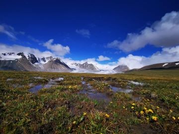 We will continue our journey to the Khoton and Khurgan lakes, which are twin lakes in the southern part of the national park. This picturesque region, known as Sirgaly (“beautiful” in Kazakh), is a favorite summer pasture for local nomads. On the way, we’ll stop at the striking White River, which flows from the Potanin Glacier. Its milky color comes from mineral-rich glacial silt. By the afternoon, we’ll arrive at the shores of Khoton Lake, giving you time to relax and fully enjoy this serene and picturesque environment.
