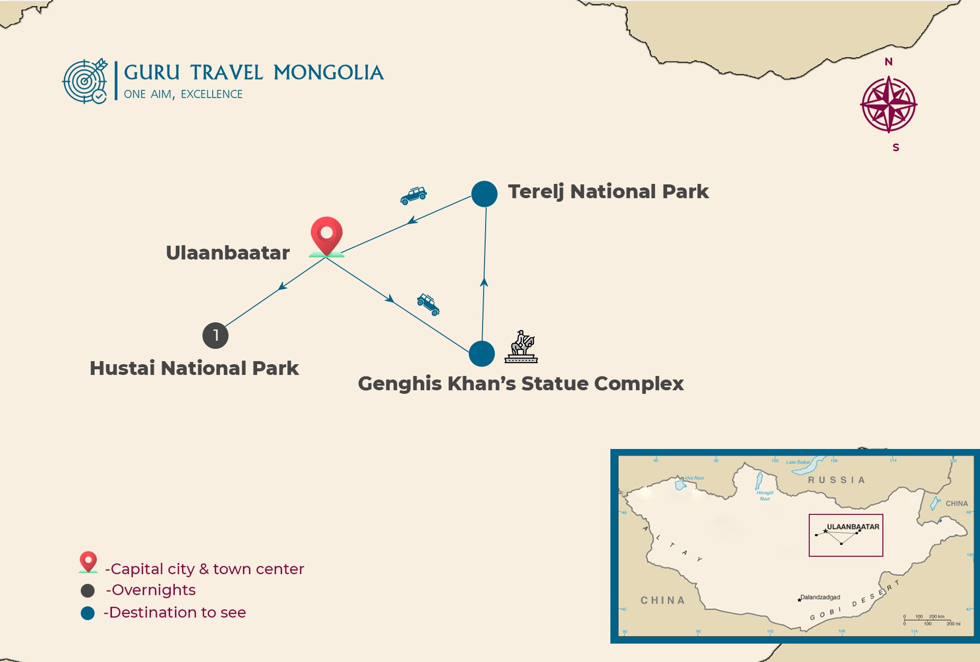 After lunch at the tourist camp, we will explore the national park and see Turtle Rock – the symbol of the National Park. You can take a photo of the rock and climb on the rock if you want. Also, visit the Ariyabal meditation temple - Once you reach the temple and stand on the top of the hill, you will be amused by the whole park view. Return to Ulaanbaatar and you will be transferred to a location of your choice.
