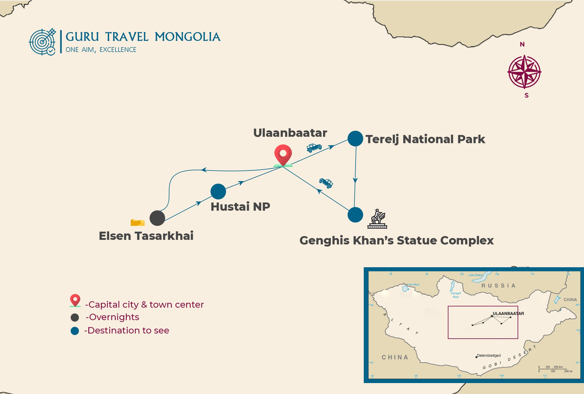 In the morning at 9am, head to “Genghis Khan Statue Complex” which is currently the biggest (40m high) equestrian statue in the world. You can go inside and enjoy museums, souvenir shops. Take a short drive to visit Terelj National Park. This is one of the nearest and the most breathtaking sightseeing from the capital Ulaanbaatar and landscape is impressive with magnificent rocky mountainous scene and a lucid river and green groves. Next see Turtle Rock – the symbol of the National Park. You can take a photo of rock and climb on the rock if you want. Also, visit the Ariyabal meditation temple - stand on the top of hill, you will be amused by the whole park view. Return to Ulaanbaatar and you will be transferred at a location of your choice.