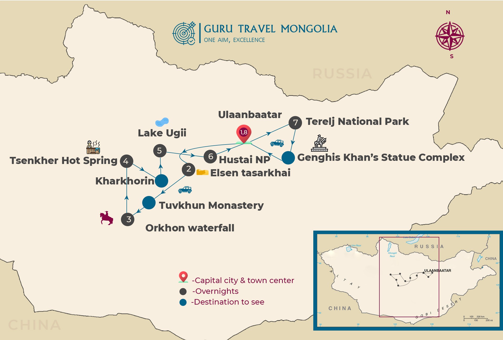 Accommodation; 9 nights’ accommodation: 3 nights at 4 star hotel, tourist Ger camp