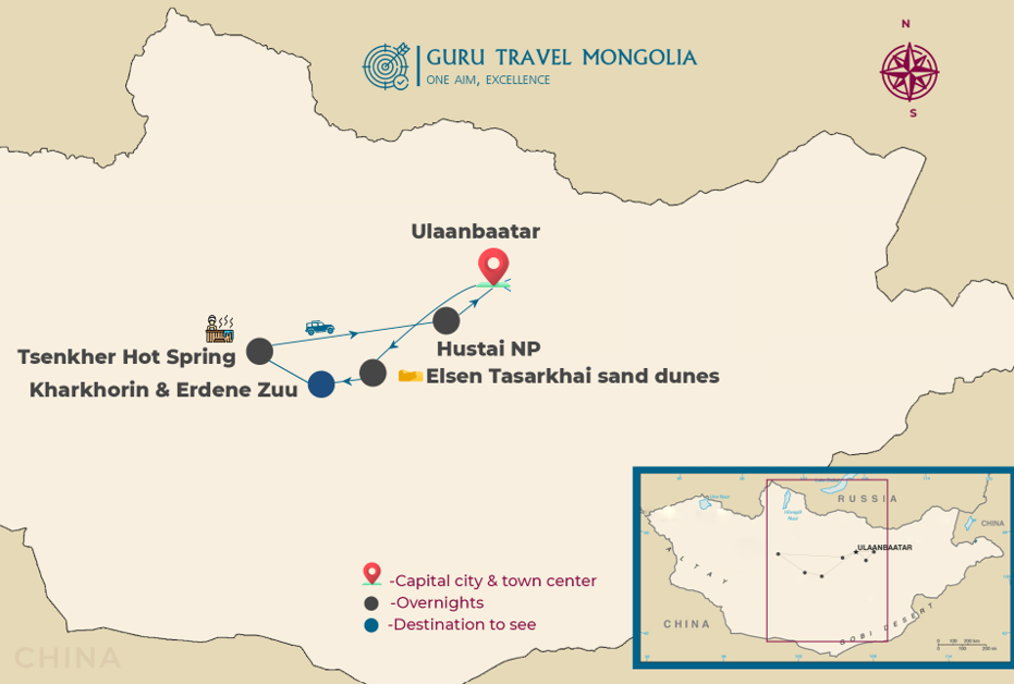 This morning, your private guide and driver will pick you up from your hotel to begin an excursion to Mini Gobi (Elsen Tasarkhai), a breathtaking landscape where golden sand dunes blend with rare shrubs like willow, elm, and dogwood, alongside a small forest by a river. This unique ecosystem is a stunning combination of mountains, forests, steppes, and desert in one location. After lunch at the tourist camp, we will visit a camel herder family to experience their nomadic lifestyle firsthand and explore the magnificent dunes on camelback. Enjoy dinner and an overnight stay at the tourist camp