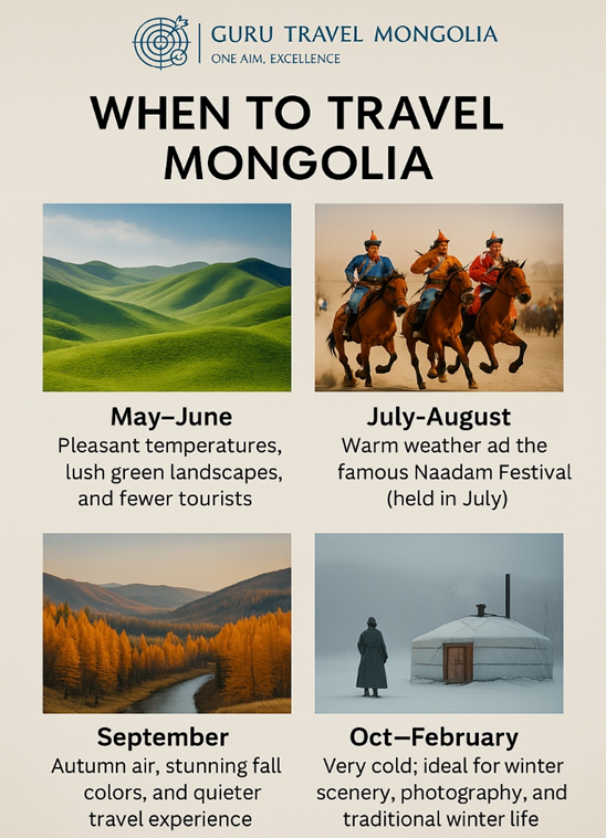 Mongolia has a four-season continental climate. Each season offers a different experience.